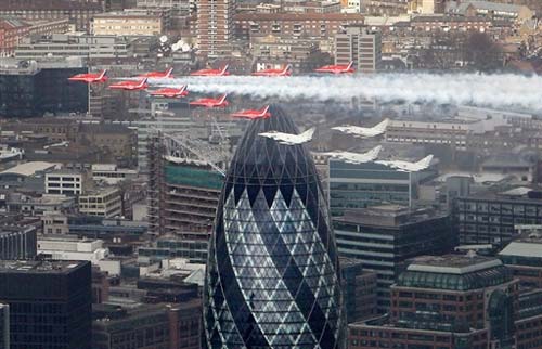 英國(guó)皇家空軍4月1日舉行飛行表演,“紅箭”飛行表演隊(duì)的飛機(jī)和4架“臺(tái)風(fēng)”戰(zhàn)機(jī)飛過(guò)倫敦上空,紀(jì)念皇家空軍建立90周年。