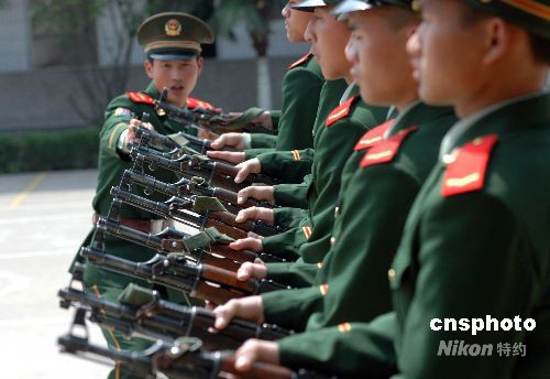 4月10日,武警南京支隊官兵在進行訓練。連日來,南京武警官兵積極備戰奧運安保工作,通過隊列及各種禮儀、處置突發事件等方面進行嚴格正規的軍政素質訓練,從而不斷提升執勤官兵形象,為維護一方穩定做貢獻。中新社發 唐占軍 攝