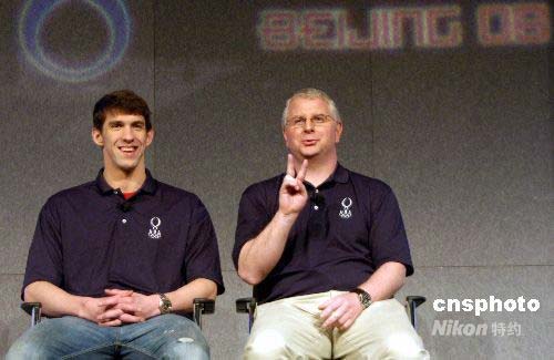 4月14日,美國(guó)泳壇“神童”菲爾普斯(左)在芝加哥表示,他在北京奧運(yùn)會(huì)的目標(biāo)是贏得所有參賽項(xiàng)目的冠軍。他的教練鮑伯·褒曼透露,過(guò)去4年中菲爾普斯已經(jīng)在體能和蛙泳兩方面有很大進(jìn)步。作者: 李靜