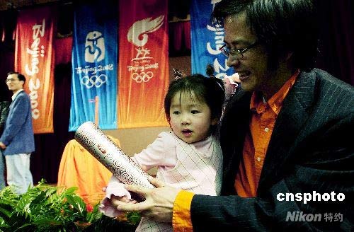 當地時間四月十八日,舊金山華人華僑喜見北京奧運祥云火炬。圖為一對父女在仔細端詳火炬。 陳鋼 攝