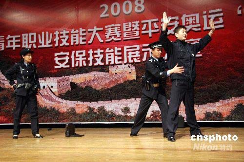 以“迎奧運、比技能、促振興”為主題的2008沈陽青年職業大賽開幕式暨奧運安保技能展示大賽4月24日在沈陽舉行。這次大賽充分展示沈陽市公安民警關注奧運、參與奧運、奉獻奧運的精神風貌,通過比賽將全面提升奧運安保人員的綜合素質、執法能力和實戰能力,打造一支高效率、高水平、符合奧運規則、體現國際水平的安保服務隊伍,確保沈陽賽區足球比賽順利進行。中新社發 趙敬東 攝