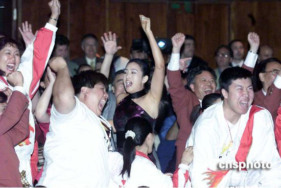 2001年7月13日,在莫斯科世界貿易中心舉行的國際奧委會112次會議中,北京獲得2008年奧運會舉辦權,代表團成員們歡慶勝利。中新社發 王瑤 攝