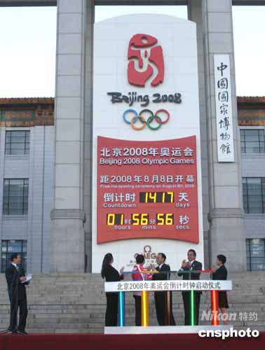 2004年9月21日18時整,二零零八年北京奧運會“倒計時鐘”在中國國家博物館門前豎起。史利 攝