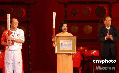 4月29日晚8時(shí)20分,在胡志明市第七軍區(qū)體育館內(nèi),越南奧委會(huì)主席阮明泰用手中的“祥云”火炬點(diǎn)燃圣火盆,北京奧運(yùn)圣火在胡志明市的傳遞就此順利結(jié)束。胡志明市歷時(shí)近兩個(gè)鐘頭的傳遞,為北京奧運(yùn)圣火“和諧之旅”國外19個(gè)城市的傳遞劃上圓滿句號(hào)。30日上午10時(shí),北京奧運(yùn)圣火將隨“奧運(yùn)圣火號(hào)”飛往“東方之珠”香港,并于下午2時(shí)左右進(jìn)入中國領(lǐng)土。圖為北京奧組委執(zhí)行副主席李炳華(右),向胡志明市副市長阮氏秋霞(中)頒發(fā)證書。中新社發(fā) 沈晨 攝