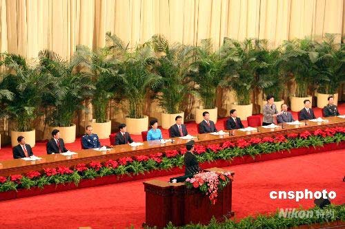 四月三十日,北京奧運會倒計時100天誓師大會在人民大會堂舉行。全國政協主席賈慶林等領導出席。中新社發 任海霞 攝