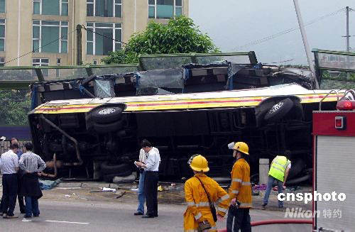 五月一日,香港發生嚴重交通意外,一旅游巴由黃大仙駛往西貢經南邊圍回旋處時翻側,造成至少十八人死亡、四十余人受傷。初步調查顯示,涉禍旅游巴超速及超載,肇事司機涉嫌危險駕駛已被拘捕。大批救護人員在現場參與搶救。中新社發 周文菁 攝