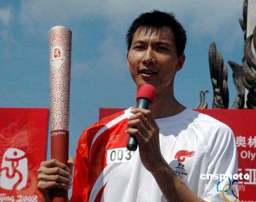在NBA效力的中國(guó)球員易建聯(lián)四日跑第三棒,他祝愿北京奧運(yùn)會(huì)取得圓滿成功。中新社發(fā) 王辛莉 攝