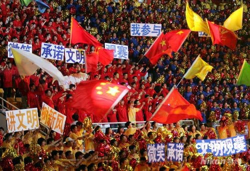 5月4日,“微笑北京、志愿奧運——北京奧運會、殘奧會志愿者誓師大會”在北京舉行,來自北京多所大學的學生代表所有志愿者,手舉標語、揮舞國旗,并莊嚴宣誓。據悉,北京奧運會、殘奧會賽會志愿者報名人數超過112萬,城市志愿者人數超過157萬。中新社發 張宇 攝