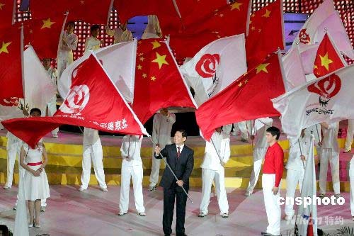 北京奧組委主席劉淇為志愿服務總團授旗。中新社發 張宇 攝