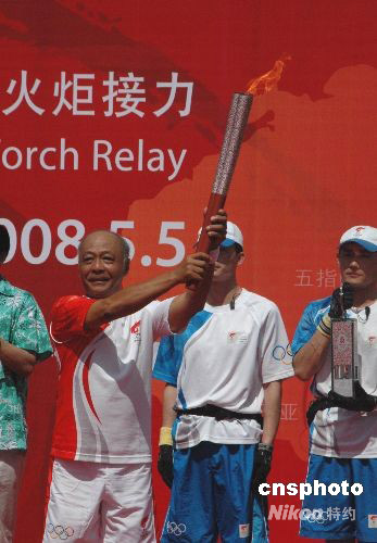 今年63歲的華僑鄭文泰作為第一棒火炬手在興隆起跑儀式上高舉火炬。 中新社發(fā) 王辛莉 攝