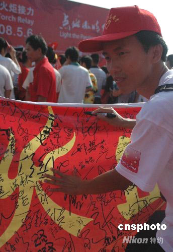 一名海口青年志愿者在支持奧運的條幅上簽字。 中新社發 王辛莉 攝
