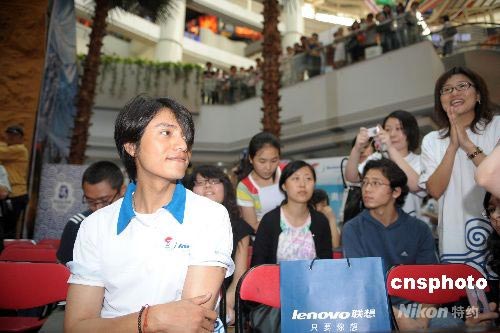 5月6日,奧運圣火傳遞火炬手演藝明星陳坤在廣州亮相。當日,奧運圣火傳遞廣州站聯想火炬手在羊城集體亮相。 中新社發 廖攀 攝