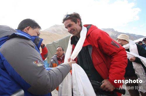 5月9日,在親眼目睹了奧運(yùn)圣火在珠峰傳遞的盛舉后,6家受邀的境外媒體的記者離開珠峰大本營絨布新聞中心,將奔赴北京。境外記者、北京奧組委的官員和工作人員、受邀的境內(nèi)記者和本次活動(dòng)的組織者道別,西藏自治區(qū)黨委宣傳部常務(wù)副部長、珠峰新聞中心主任沈開運(yùn)前來送行。圖為工作人員向境外記者獻(xiàn)上了潔白的哈達(dá)。中新社發(fā) 盛佳鵬 攝