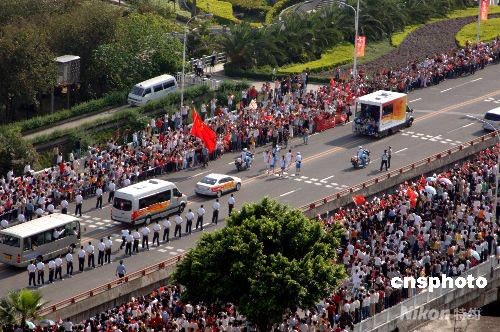 5月11日下午,北京奧運(yùn)火炬在福州最美的江濱大道進(jìn)行傳遞,現(xiàn)場(chǎng)盛況空前。 中新社發(fā) 王東明 攝
