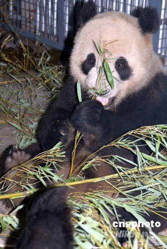 5月24日,來自四川臥龍的8只大熊貓平安抵達北京動物園,開始新的生活。此次進京的8只奧運大熊貓,是今年3月21日啟動的“2008四川臥龍大熊貓奧運北京行”投票評選活動中,由廣大網民從16只大熊貓里選出來的。這8只熊貓,雌雄各半,現在的年齡都在1歲9個月之間,屬亞成體,正是最活潑可愛的年華。 中新社發 羅小韻 攝