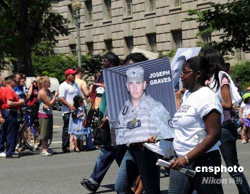 一些反戰組織也舉行了反戰示威,他們高舉在伊拉克戰場上陣亡的士兵畫像,要求布什政府盡快撤軍。中新社發 邱江波 攝