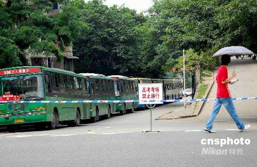 重慶市北碚區西師附屬中學外拉起了“禁止車輛通行”的警戒線,全力保證高考期間考場周圍的安靜狀態,讓考生考出最佳成績。中新社發 許康平 攝