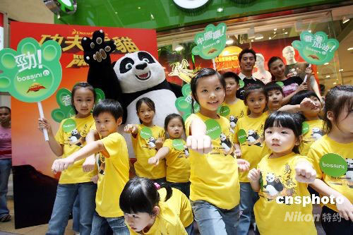 六月十九日,香港一服飾連鎖店推出動畫電影《功夫熊貓》服飾系列,一群穿著功夫服飾的小朋友與功夫熊貓“阿寶”登場造勢。中新社發 洪少葵 攝