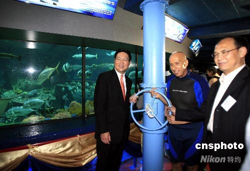 香港特區商務及經濟發展局局長馬時亨(左)、全國水生野生動物保護分會會長李彥亮(右)、海洋公園主席盛智文在海洋公園海洋館為中華鱘新居揭幕。中新社發 王麗南 攝