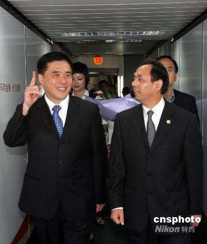 圖為郝龍斌(左)與上海市臺辦主任楊建榮(右)在機場談笑甚歡。中新社發 潘索菲 攝