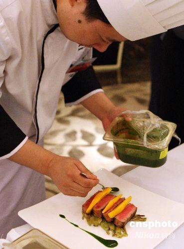 6月25日晚,由國家體育總局訓練局、中國烹飪協會西餐專業委員會和亨氏公司聯合主辦的“亨氏冠軍西餐,引領健康美味”主題活動發布會暨體育概念創意菜肴征集活動頒獎典禮在北京舉行。此次活動歷時近兩個月,吸引了近百家京城優秀的西餐廳和潮流餐廳踴躍參與,近百道創意紛呈的體育概念菜肴亮相。左岸春天、漢萊國際美食百匯、梧桐、北京亞太花園酒店、西堤牛排、挪威北極菜、金融街洲際酒店季候風、香格里拉飯店藍韻、希爾頓元素閣和希爾頓三煌苑等十家餐廳所創作的菜品憑借出色的菜肴創意和體育概念闡述,榮獲了本次活動的最高榮譽“特金獎”。作為本次活動的成果展示和廚藝交流,獲獎餐廳的大廚們現場制作和展示了集健康、美味于一體的體育概念菜品。圖為廚師們現場制作獨特創意的體育菜肴。 中新社發 錢興強 攝