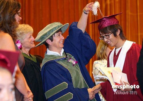 六月二十八日,北京中加學(xué)校2008年高中及IHM專業(yè)學(xué)生畢業(yè)典禮在北京人民大會(huì)堂舉行,321名學(xué)生經(jīng)過在該校三年的學(xué)習(xí),獲得中國和加拿大兩國高中畢業(yè)證書,其中有314名學(xué)生申請了加拿大的大學(xué),并被加拿大及歐美、澳大利亞共68所大學(xué)錄取,錄取率為100%。圖為加拿大教育官員為畢業(yè)學(xué)生撥帽繩。中新社發(fā) 毛建軍 攝