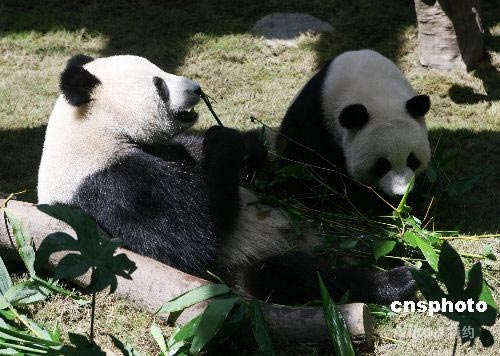 樂樂、盈盈在香港海洋公園享受美味的竹子。中新社發(fā) 武仲林 攝