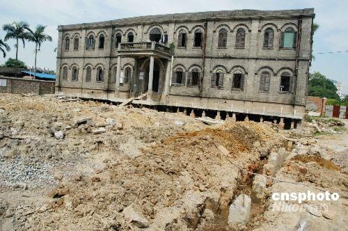 2008年7月3日,福州老洋房泛船浦教堂神父樓在上百個千斤頂?shù)闹蜗码x地1米,準(zhǔn)備整體平移。這棟老洋房由于位于建設(shè)規(guī)劃范圍內(nèi),經(jīng)過一年多準(zhǔn)備,福州市有關(guān)部門決定對泛船浦教堂神父樓實施整體平移,以利于文物保護(hù)和減少經(jīng)濟(jì)損失。這幢樓將先往東平移75.6米,再整體旋轉(zhuǎn)90度向南平移30.7米,由東西朝向變?yōu)槟媳背颉T摻烫媒ㄓ?932年秋,1933年9月落成,耗資17萬銀元,建筑風(fēng)格屬半哥特式、半法國式。中新社發(fā) 張 斌 攝