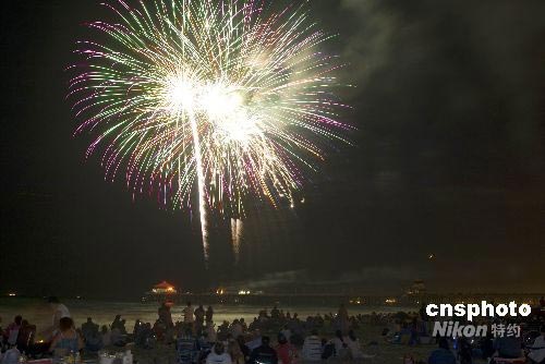 七月四日是美國獨立日,當晚,美麗的煙花在美國南加州海灘上空綻放,數以萬計的民眾在海灘觀看煙花表演。據美國煙花協會透露,目前美國百分之九十八的普通煙花來自中國,百分之八十的專業煙花來自中國。獨立日燃放煙花已經成為美國的傳統民俗。中新社發 張煒 攝