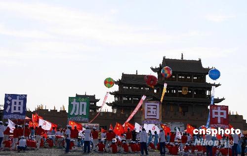 7月6日,北京奧運火炬穿越“天下第一雄關”嘉峪關,現場觀眾打出“中國加油”的標語。嘉峪關是明長城的西端起點,也是目前長城沿線保存最完整的一座雄關。中新社發 周兆軍 攝