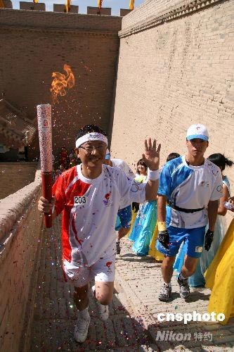第203棒火炬手楊壯沿著臺(tái)階登上“天下第一雄關(guān)”的城樓。中新社發(fā) 周兆軍 攝