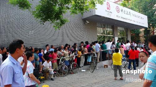 北京社區居民晝夜排隊兌換奧運紀念鈔。中新社發 張愛東 攝