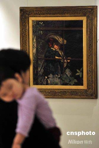 倫敦蘇富比將于年底舉行英國藝術拍賣,并在拍賣前于世界各地舉行巡回展覽。七月十四日,香港蘇富比舉行拍賣傳媒預展。圖為《今天不能散步》(作者:蘇菲安迪信)估價約九百萬至一千二百萬港元。作品描繪小女孩整裝待發,準備外出散步,卻見雨點灑在玻璃屏上;陽光雖親吻小孩的臉龐,卻不掩其若有所失之態。中新社發 譚達明 攝