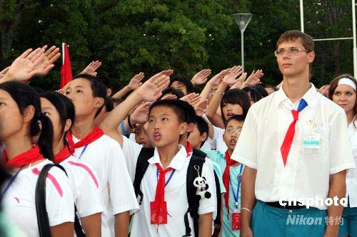 圖為升旗儀式上的中國地震災區中小學生和他們的俄羅斯輔導員。中新社發 田冰 攝