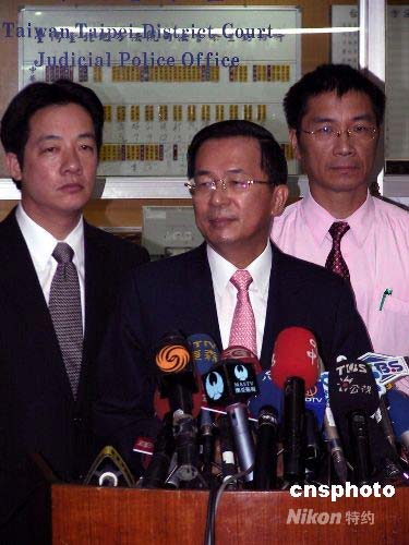 7月21日上午,臺北地方法院開庭審理臺灣地區前領導人陳水扁(中)及民進黨籍“立委”賴清德(左)、前“立委”徐國勇(右)等被控誹謗案,陳水扁首度以被告身份到庭應訊。庭審之后,陳水扁與賴清德、徐國勇在臺北地院召開記者會。中新社發 徐長安 攝