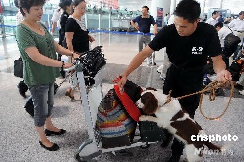 中國民航局日前發(fā)布通告:自7月20日始,北京首都機(jī)場、上海虹橋、上海浦東、青島、天津、沈陽、秦皇島,以及新疆維吾爾自治區(qū)、西藏自治區(qū)等19個機(jī)場實(shí)行特別安檢措施,包括乘機(jī)的旅客、送機(jī)的人員、航空公司和機(jī)場工作人員以及任何物品,否則,安檢工作人員有權(quán)拒絕其進(jìn)入候機(jī)樓。圖為北京首都國際機(jī)場特檢人員攜警犬上崗執(zhí)勤。中新社發(fā) 陳文 攝