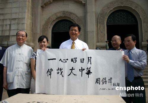 七月二十六日,臺(tái)北縣長(zhǎng)周錫瑋率臺(tái)北縣南京參訪團(tuán)一行十人拜謁南京中山陵,題字“一心昭日月,偉哉大中華”。周錫瑋一行二十五日晚間乘坐南京首航后的第四班兩岸周末包機(jī)抵達(dá)南京祿口國際機(jī)場(chǎng),開始為期五天的訪問行程。中新社發(fā) 朱曉穎 攝