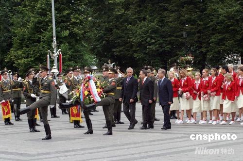 圖:俄羅斯代表團向無名烈士墓敬獻(xiàn)花籃