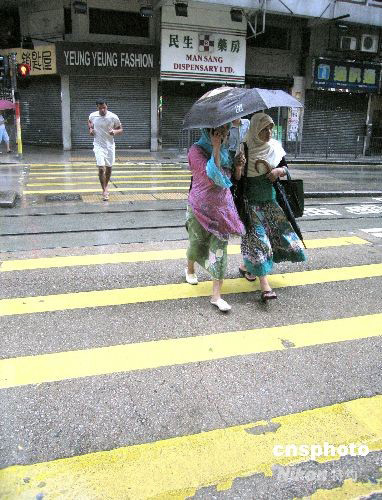 八月六日,強(qiáng)烈熱帶風(fēng)暴“北冕”襲港,天文臺(tái)發(fā)出八號(hào)風(fēng)球信號(hào),公共交通停運(yùn)、商場(chǎng)關(guān)門。圖為平日熱鬧的街道路人稀少。中新社發(fā) 張勤 攝