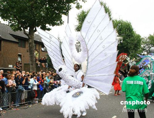 當地時間25日,歐洲最大規模的街頭文化藝術節——一年一度的英國諾丁山狂歡節在倫敦舉行,今年的主題是“歡迎世界”。圖中白色大鳥的翅膀上寫著“歡迎來倫敦”。中新社發 李鵬 攝