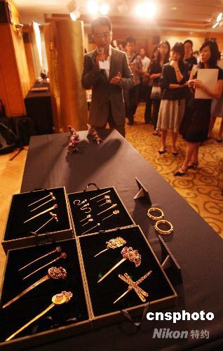 九月十日,香港國際藝展公司向傳媒展示一套華美精巧的黃金發飾,估計拍賣價在八百萬港元。該公司主辦的 “2008香港國際古玩及藝術品博覽會”將在十月四日至七日在會展中心舉行。中新社發 洪少葵 攝