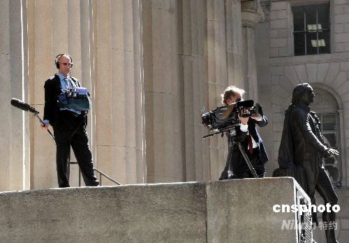 華爾街連日來大事連連,成為全世界媒體關(guān)注的新聞熱點(diǎn)。9月19日,多家媒體守候在紐約證券交易所門外,隨時(shí)準(zhǔn)備播報(bào)華爾街第一手動(dòng)態(tài)。中新社發(fā) 魏晞 攝