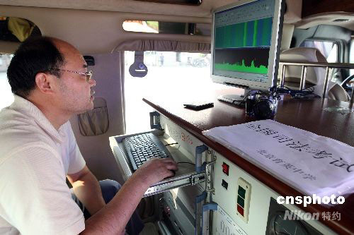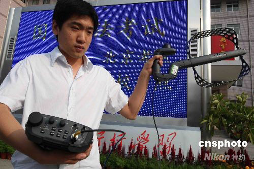 北京市司法局與北京市無線電管理局等按照“人防”與“技防”相結合,采用新型的技術設備--無線耳機探測器和全功能考場信號擾斷儀配備給考點。對疑似利用無線電通訊設備作弊或與考場外無線電通訊設備串通作弊的信號進行監測,必要時采取技術手段予以阻斷。對已經確認,情況屬實,違反治安管理規定或涉嫌犯罪的,交由公安機關依法查處。中新社發 任海霞 攝