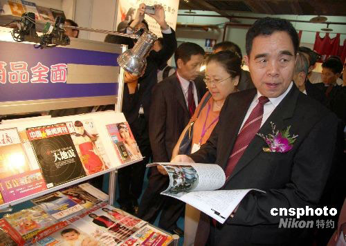 9月20日,第四屆海峽兩岸圖書交易會在臺北世貿中心三館開幕,中新社主辦的《中國新聞周刊》現身第四屆海峽兩岸圖書交易會。圖為大陸參訪團團長、新聞出版署署長柳斌杰參觀大陸期刊綜合展區時,觀看《中國新聞周刊》。中新社發 陳立宇 攝