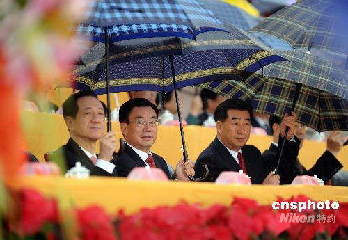 9月23日上午,干旱少雨的銀川降下甘露,寧夏回族自治區成立50周年慶祝大會在銀川覽山劇場隆重召開,中共中央政治局常委、中央紀委書記賀國強率中央代表團出席。中新社發 廖攀 攝