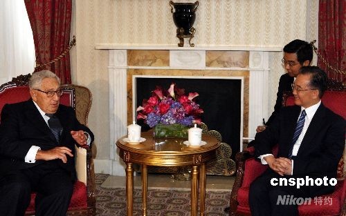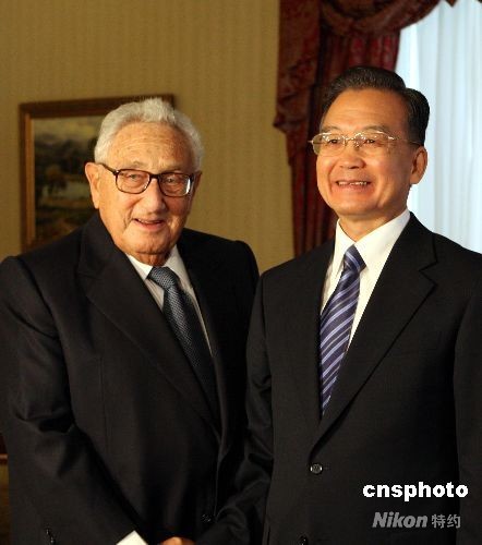 中國(guó)總理溫家寶23日在紐約會(huì)見美國(guó)前國(guó)務(wù)卿基辛格。中新社發(fā) 李靜 攝