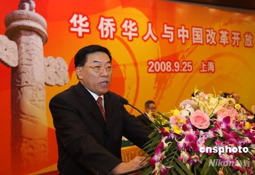 9月25日,中國(guó)僑聯(lián)主席林軍在上海舉行的“華僑華人與中國(guó)改革開(kāi)放紀(jì)念大會(huì)”上演講,盛贊華僑華人在中國(guó)改革開(kāi)放中作出了獨(dú)特的貢獻(xiàn)。中新社發(fā) 史利 攝