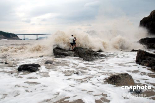 9月28日,受超強臺風“薔薇”影響,浙江溫州市洞頭島海域已是波濤洶涌,海礁上掀起的巨浪高達10多米。下午2時許,一對外地父女在海邊游玩時不慎被突漲的潮水困在礁石上,隨時可能被海浪吞噬。正在海邊巡邏的洞頭邊防大隊官兵發(fā)現(xiàn)險情后,迅速展開緊急營救,成功將父女從海浪中安全救上岸。中新社發(fā) 吳水斌 攝