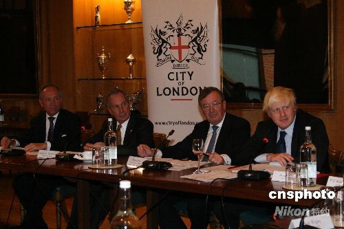 當地時間6日下午,紐約市長邁克爾·布隆博格在倫敦金融城,與倫敦市長鮑里斯·約翰遜及倫敦金融城的高層舉行圓桌會談,商討金融形勢。圖為布隆博格(左二)、約翰遜(右一)、倫敦金融城資源與政策委員會主席斯圖亞特·弗雷澤(右二)和副主席邁克爾·斯奈德(左一)。中新社發 李鵬 攝