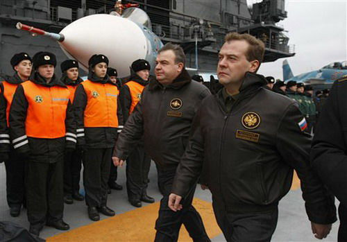 梅德韋杰夫10月11日在巴倫支海域視察了俄北方艦隊“庫茲涅佐夫海軍元帥”號航空母艦,并在這艘航母上觀摩了代號為“德維納”的艦隊軍事演習,演習中一艘核潛艇成功試射了一枚洲際彈道導彈。本次演習是在正在進行“穩定-二00八”首長司令部戰略演習框架內實施的。